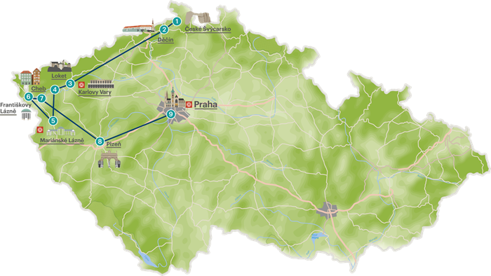 Næste stop er Karlovy Vary, Tjekkiets mest berømte kurby og et af landets mest elegante rejsemål. Byen er kendt for sine varme kilder, overdådige kurhoteller og farverige bygninger i klassisk stil, der ligger langs floden Teplá. Man kan gå en tur langs de overdækkede søjlegange og smage det mineralholdige kildevand fra de forskellige kilder – hver med sin egen temperatur og smag. Vřídlo-kilden, der sprøjter varmt vand på 72 grader 12 meter op i luften, er den mest imponerende. Karlovy Vary er også kendt for sin årlige internationale filmfestival og for likøren Becherovka, som har sit eget museum i byen.