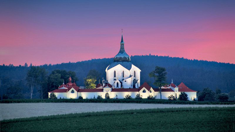 Während beim Friedhof die Zahl Drei bzw. Vier eine Rolle spielen, geht es bei der dazugehörigen Kirche - der Wallfahrtskirche des Heiligen Johannes von Nepomuk - um die Zahl Fünf: Fünf Tore, fünf Kapellen, fünf Altare und fünf Sterne. Der Grundriss stellt also einen fünfzackigen Stern dar, ein beliebtes Motiv des barocken Architekten J. B. Santini-Aichl. Beim Besuch dieses mystischen Ortes verstehen Sie sofort, warum er auf der UNESCO-Weltkulturerbeliste steht.