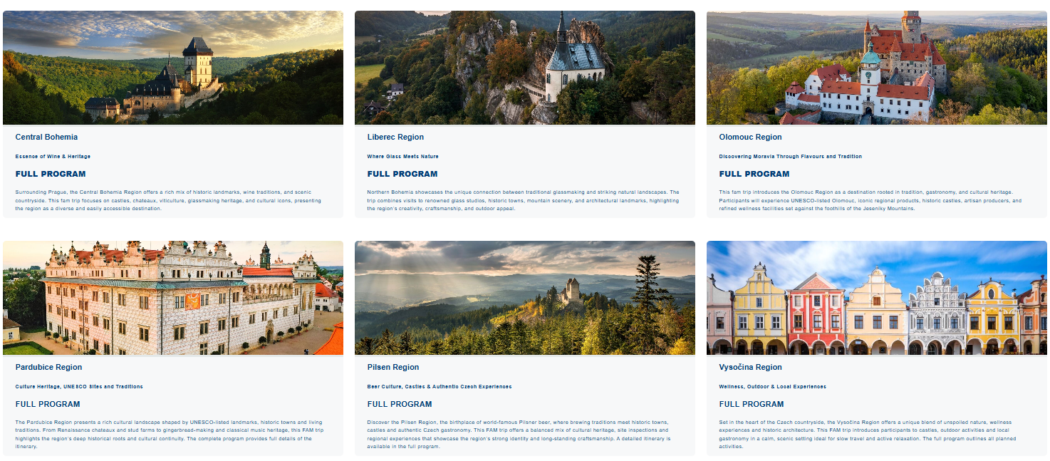 Detailierte Programme einzelner Inforreisen finden Sie auf der Homepage der Veranstaltung unter Czechia Travel Trade Day 2026Zur Auswahl stehen die Regionen: