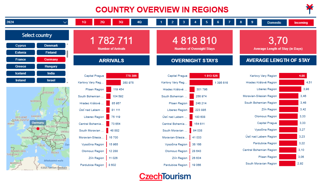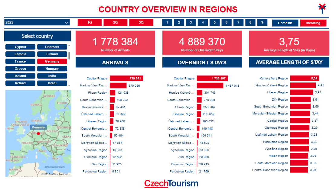 Die Hauptstadt Prag hat im Jahresvergleich niedrigere Zahlen verzeichnet, andere Regionen haben sich über einen Zuwachs gefreut. Zu den meistbesuchten gehören traditionell die Nachbarregionen (Karlsbad, Pilsen, Südböhmen, Ústí) und die Riesengebirgsregionen Liberec und Hradec Králové. Weiter folgt die Region Mittelböhmen um Prag und danach folgen die mährischen Regionen im Osten der Republik, mit der Weinregion Südmähren an der Spitze.
