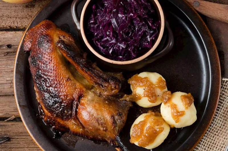 - Vila Fitz in Pilsen: the menu includes duck pâté in red wine, goose soup with homemade noodles and root vegetables, confit goose leg, red cabbage with cranberries and a pear tart with cloves and meringue for dessert.