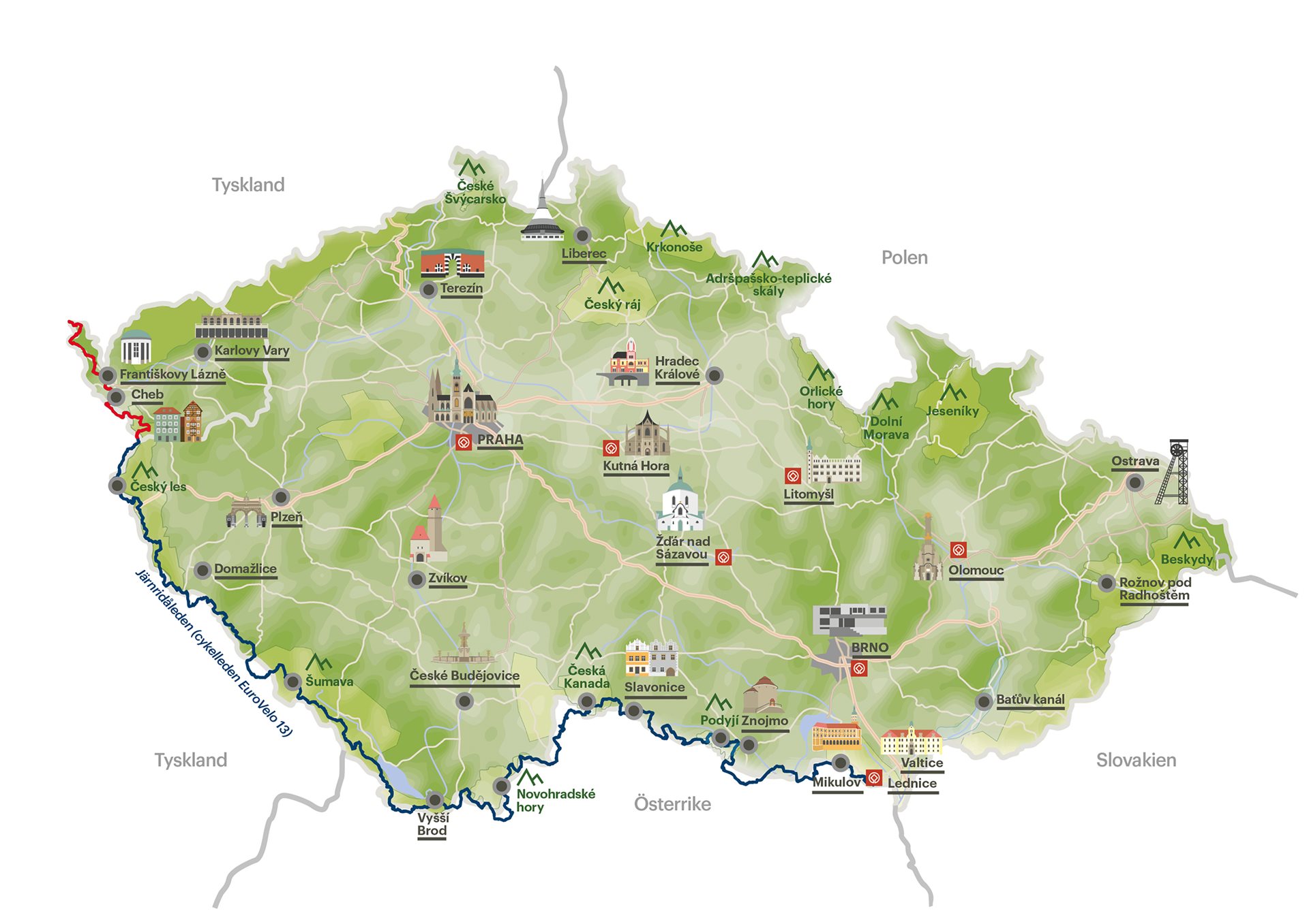 Längs vägen kan du besöka Tjeckiens västligaste punkt (du kan bara ta dig dit till fots) och Europabron – Vänskapsbron, som sammanbinder Tjeckien med Tyskland. Värt ett besök är även Bismarcks utkikstorn, som ligger på den högsta toppen i den tjeckiska delen av Smrčina på berget Háj (758 m ö h). Från denna storslagna 34 meter höga utkikspunkt i sten kan du speja ut över det vackra landskapet i Karlovy Vary-regionen och de angränsande delarna i Tyskland. Leden fortsätter längs den tyska gränsen genom den historiska staden Aš, där vi rekommenderar ett besök på Textilmuseet som har Europas största samling av handskar. Fortsätt till slotten i Hohenberg, Libá och Ostroh till de klassiska kur-och spaorterna Františkovy Lázně (Franziskenbad) och Mariánské Lázně (Marienbad).