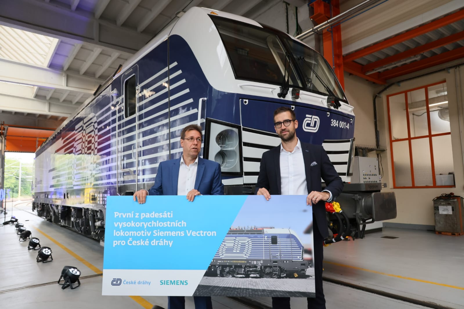 新款 Vectron 384 系列機車(時速可達 230 公里)於近日正式亮相,參與者包括 ČD 董事會主席暨總裁 Michal Krapinec(右)以及 Siemens Mobility 捷克分公司 CEO Roman Kokšal(左)。